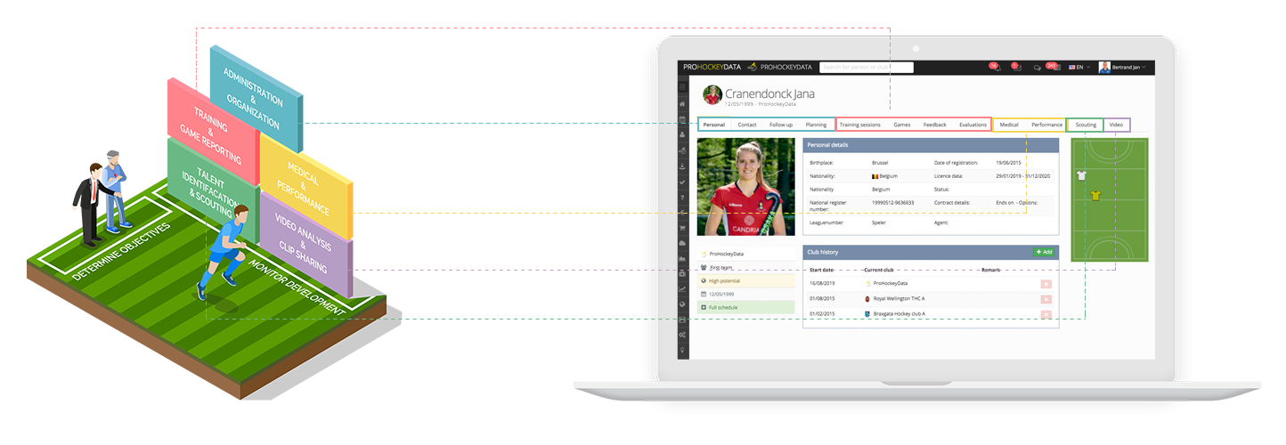 La plateforme ProHockeyData permet aux membres du staff de planifier et de consulter les activités du club mais encore de soumettre des rapports sportifs. En collaborant tous sur la même plateforme les données des joueurs sont centralisées sur un profil unique permettant un suivi plus optimal.